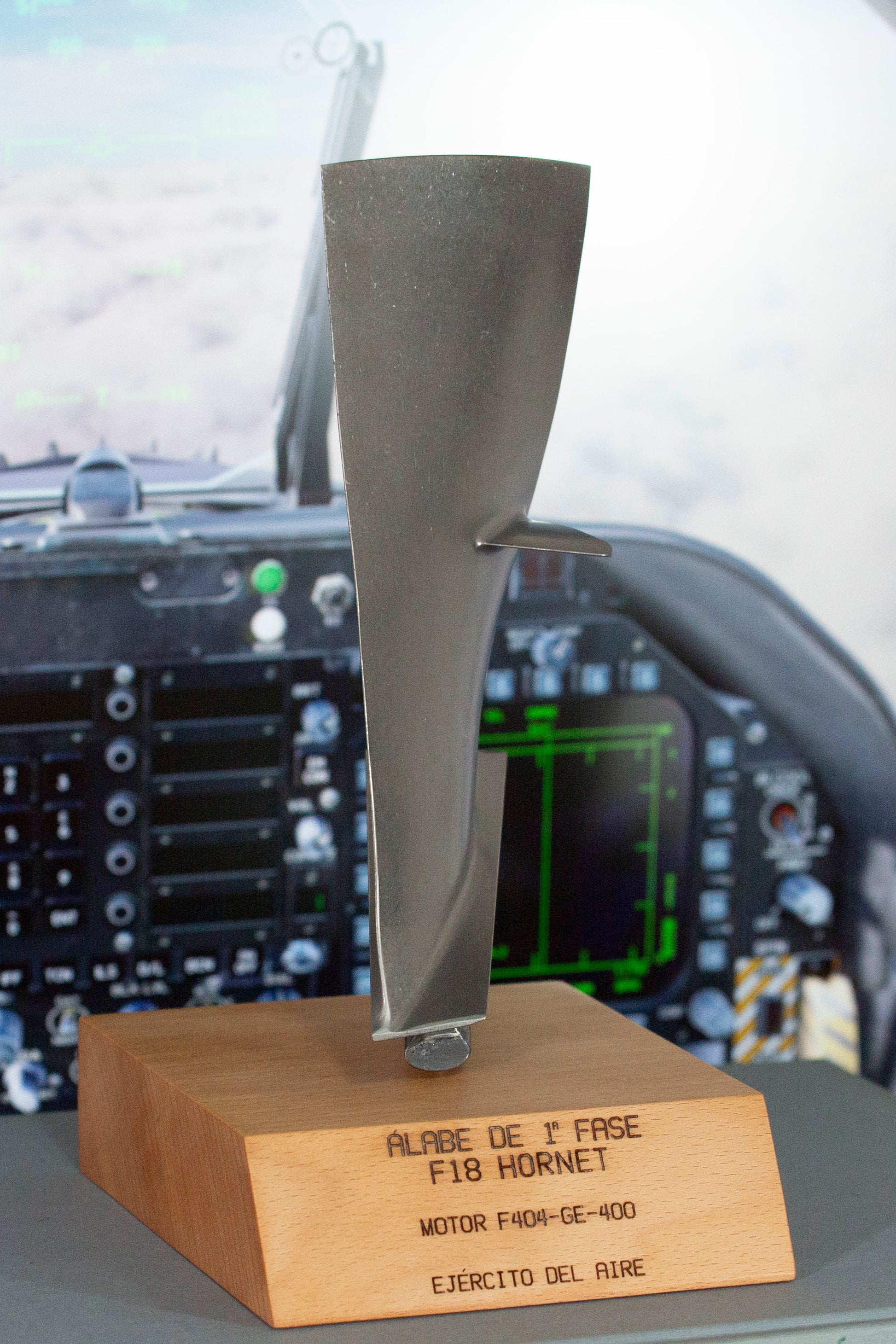 Álabe de 1ª fase de un caza de combate F18 Hornet del Ejército del Aire Español, pieza original retirada de servicio en 2017 por superar el límite de su vida útil.