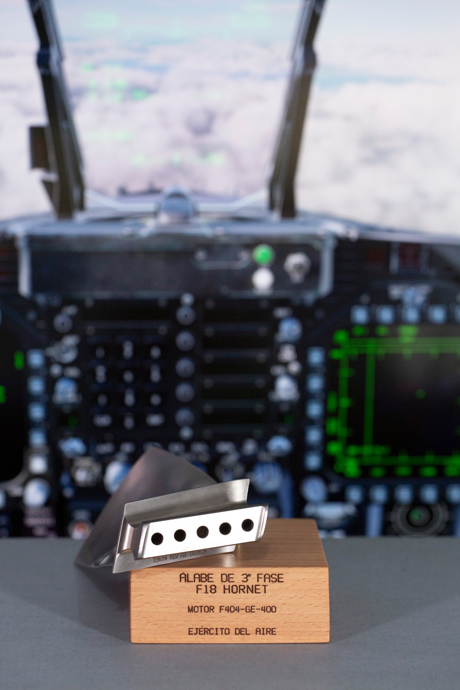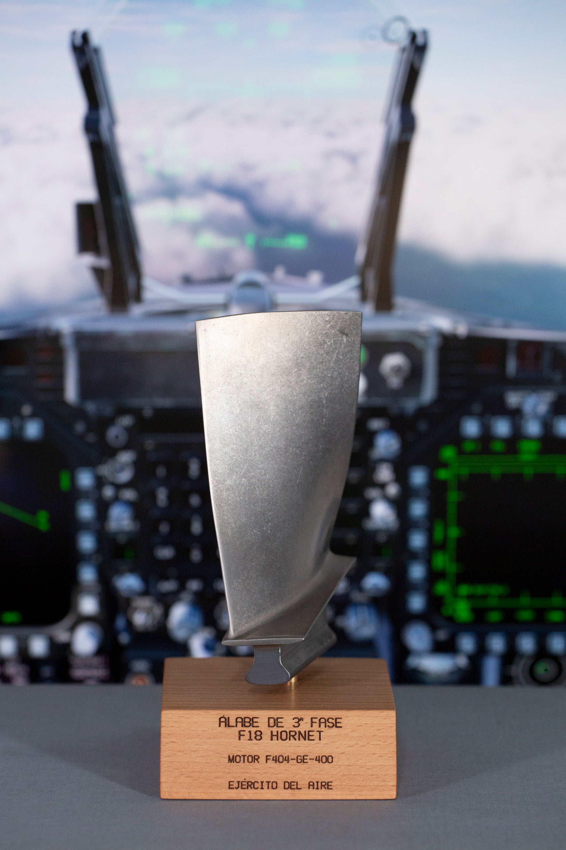 Álabe de 3ª fase grande de un caza de combate F18 Hornet del Ejército del Aire Español, pieza original retirada de servicio en 2016 por superar el límite de su vida útil.